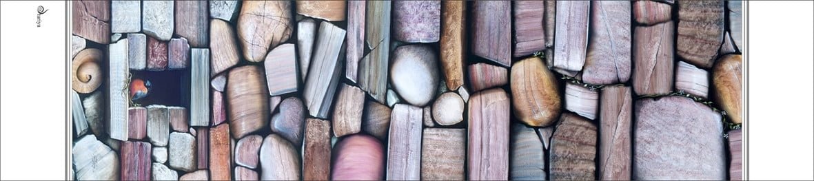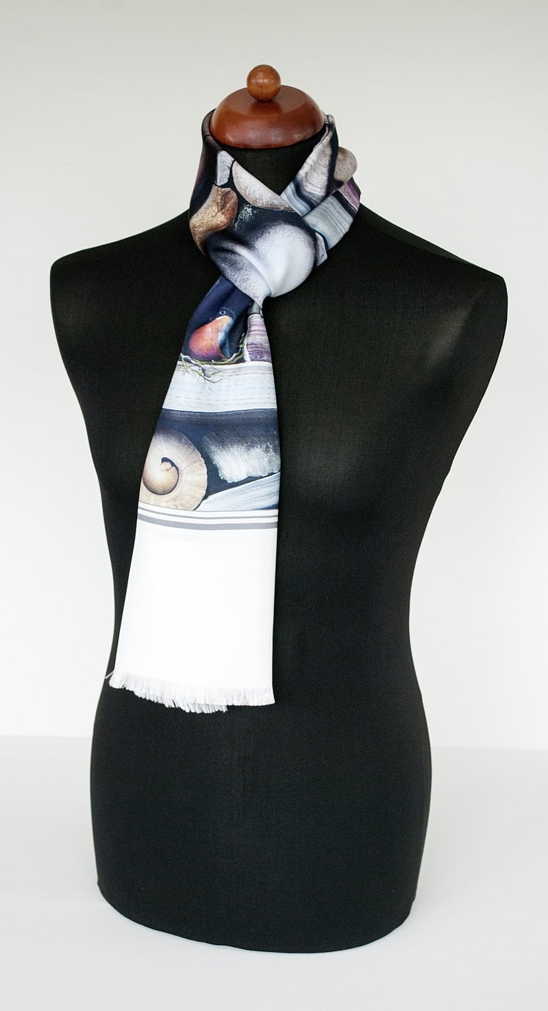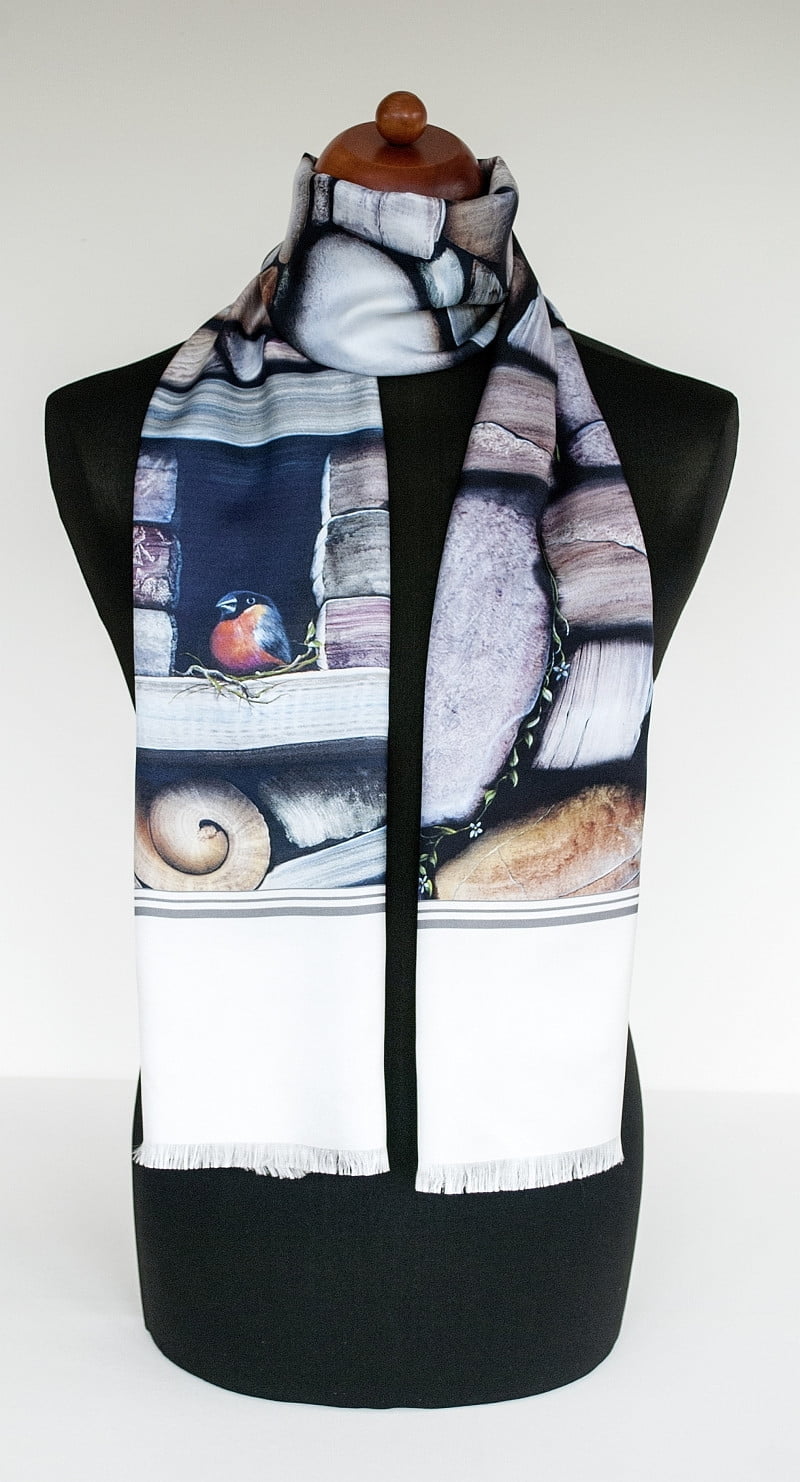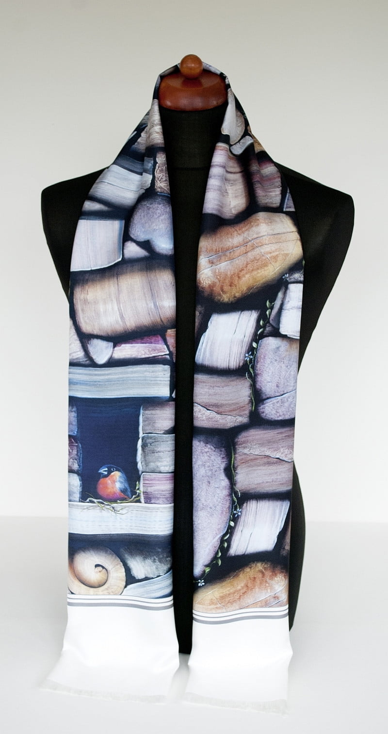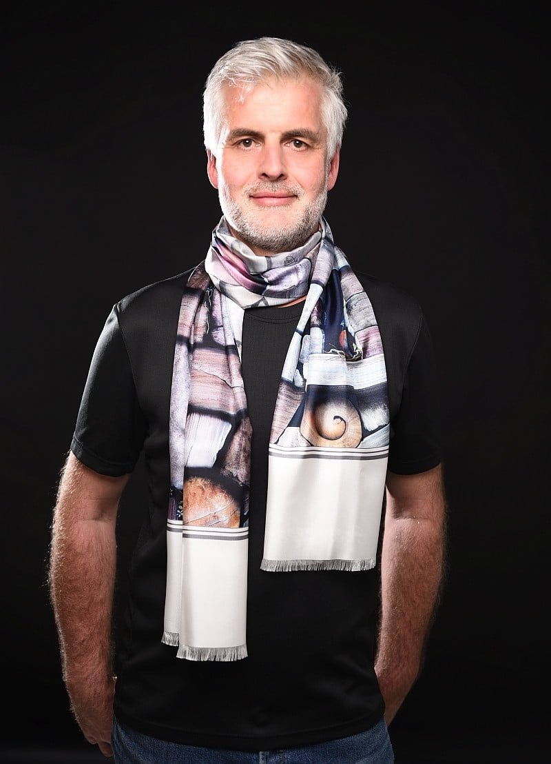 Ein Porträt von Optimismus, Ausdauer und Überleben zwischen Hindernissen und Barrieren. Maßgetreue Details von Steinen in realen Farben sind eine Spezialität des Künstlers. Und oft findet man in seiner Kunst die Spirale, eine Darstellung der Lebenskraft, die immer nach Wegen sucht und findet, um zu wachsen und zu gedeihen. Ein eleganter Schal für Männer, passend für alle Gelegenheiten.