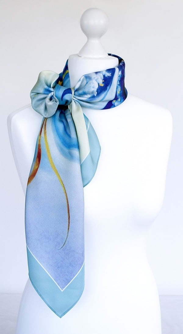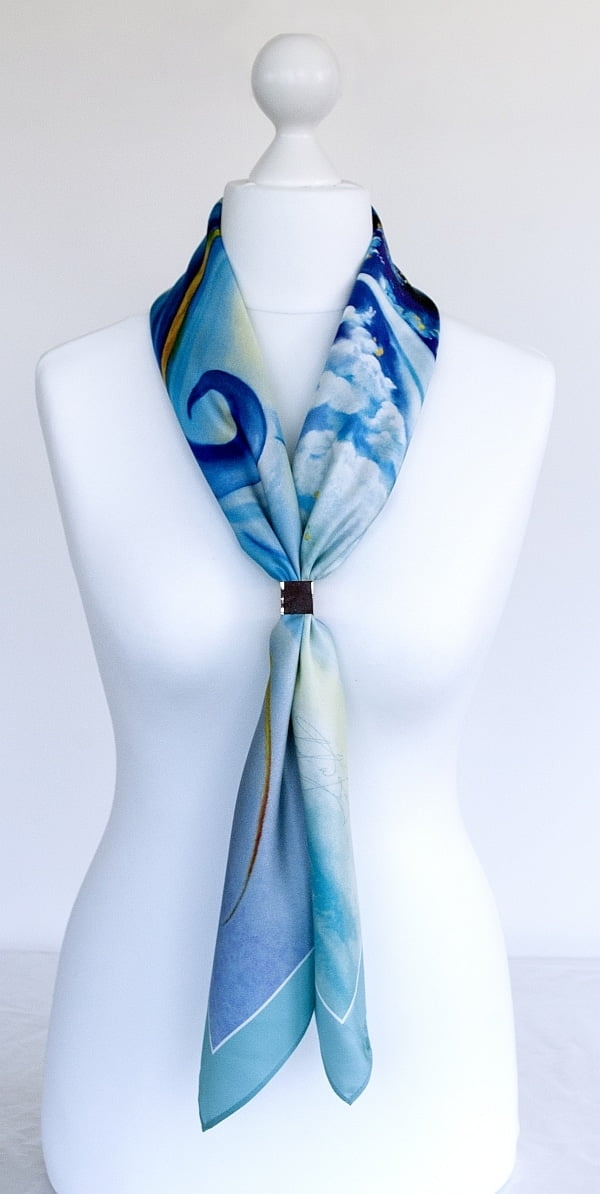 Bewegungen innerhalb einer Welle der Freude, die auf dem Meer tobt und wogt, während sie die goldenen Strahlen der Sonne einfängt. Kühl, zart und elegant, eine sehr harmonische Komposition, die sowohl Anmut als auch Zuversicht enthält. Eine perfekte elegante Stola für die Abendgarderobe oder als lässiger Schal für alle Gelegenheiten.
