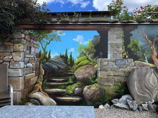 Wandmalerei am Anfang und Wandmalerei vollendet, die fast perfekte Illusion.